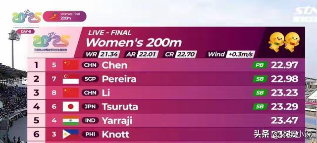 北京时间5月31日,亚洲田径锦标赛迎来一场焦点大战,在备受关注的女子200米决赛上,中国16岁的小将神了,陈妤颉大爆发,跑出22秒97的成绩获得了冠军,这个冠军赢得非常惊险,仅比第二名的卫冕冠军佩雷拉快出0.01秒,这允许说是极限绝杀了,非常的让人振奋人心,本场比赛也产生三大不可思议!