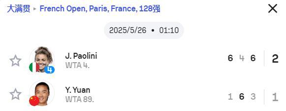北京时间5月26日凌晨,法网女单第1轮一场比赛,由鲍里妮对阵袁悦。最终,袁悦大比分1-2惜败鲍里妮,无缘逆转晋级,依然收获10个积分、64万元奖金。